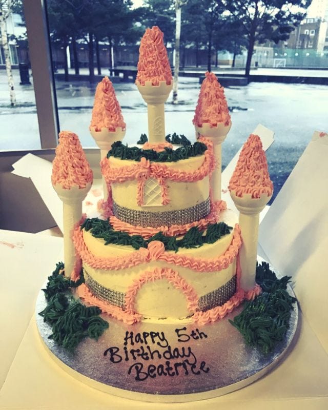 Finally, I managed to embarrass myself into oblivion by bringing a GIANT CASTLE CAKE (seriously, the bottom tier was around 18 inches) to a party Beatrice was sharing with two other children, where the other two children had rather modest cakes. Giles thinks Beatrice will now get invited to fewer parties because of me. I'm such a jerk.