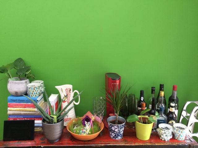 BUT: something is changing, maybe. I recently bought an epipremnum for Beatrice (look at me with my fancy Latin names), aka a pothos, or devil's ivy, similar to a philodendron, and it has not died. In fact, it has grown a few extra leaves. So I thought I would try to propagate it. I happened to be in IKEA, where they didn't have their regular soil pellets, but they did have some herb kits, so I bought a couple for next to nothing and came home with all the soil I could want--it turns out for a lot of things. Now I seem to have a pothos, an aloe vera plant I have somehow kept alive for actual weeks, a fairy garden with grass in it that hasn't died, a dragon plant which I may have already killed by watering it when I got home, a propagated pothos, four paper cups with seeds (basil and parsley), and a pot outside with mint seeds.